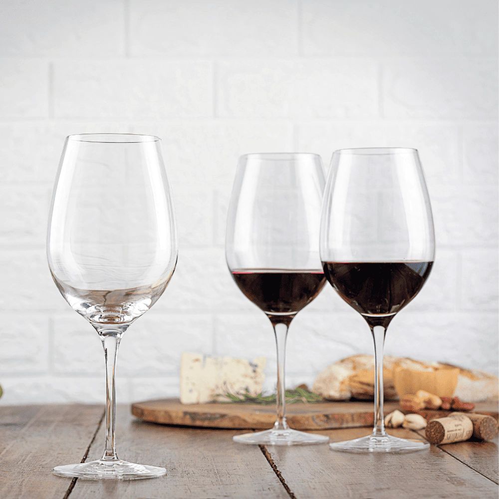 Cada taça possui capacidade de 650ml, ideal para vinhos Bordeaux, permitindo a aeração adequada e a concentração dos aromas.